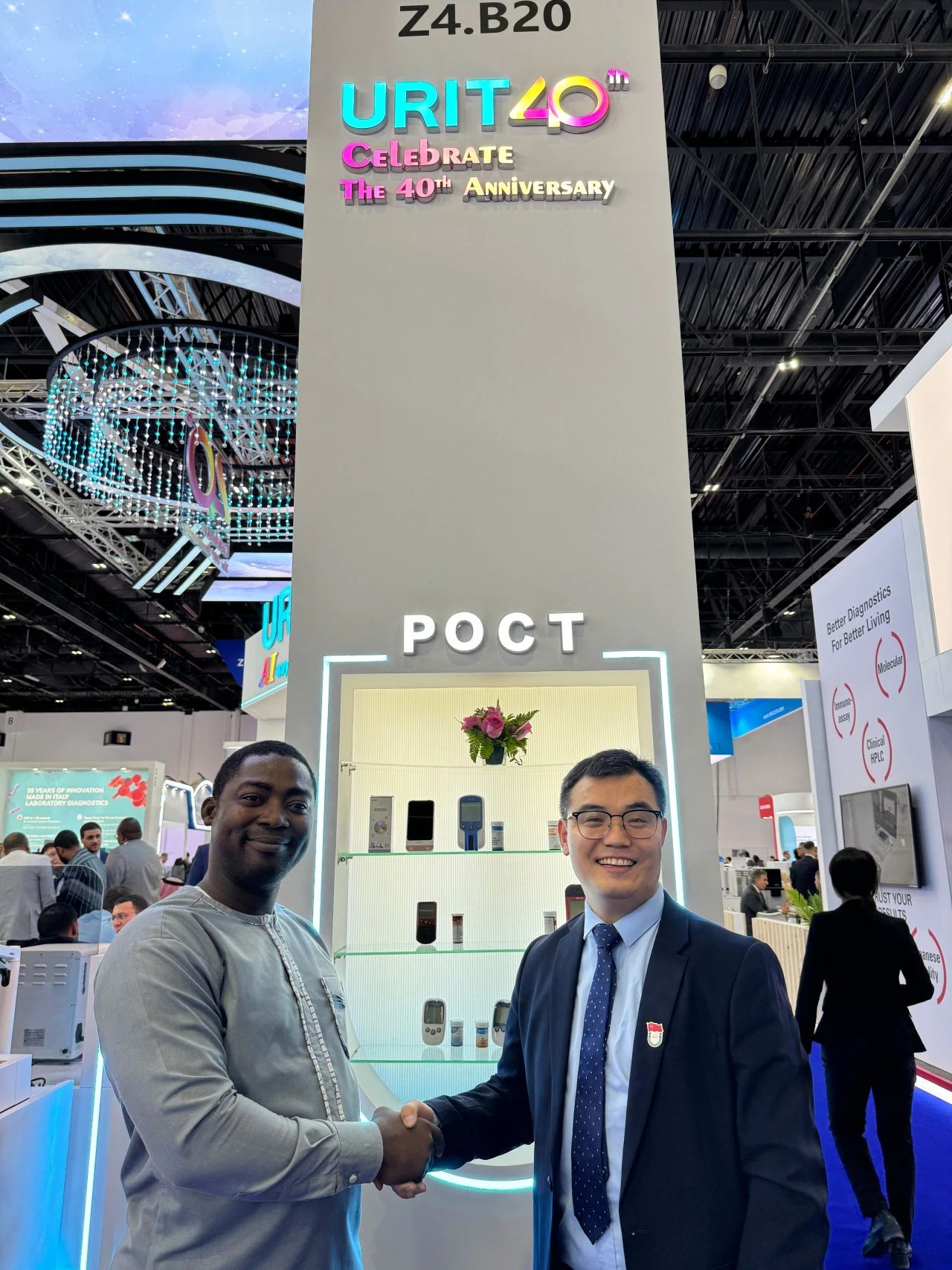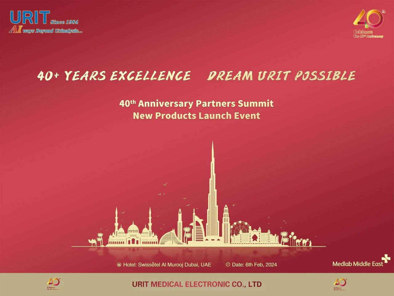 On February 5, 2024, the Medlab Middle East exhibition, a major event in the medical device industry in the Middle East, grandly opened at the Dubai World Trade Centre. This year's exhibition brought together over 700 renowned exhibitors from nearly 100 countries. URIT International Marketing Center, a veteran participant for over a decade, made another impressive appearance. To celebrate its 40th anniversary, URIT set up a large outdoor advertisement at the parking area outside the venue. The advertisement featured the iconic Burj Khalifa alongside URIT’s urinalysis and hematology analyzers, highlighting its brand image and attracting many visitors' attention.